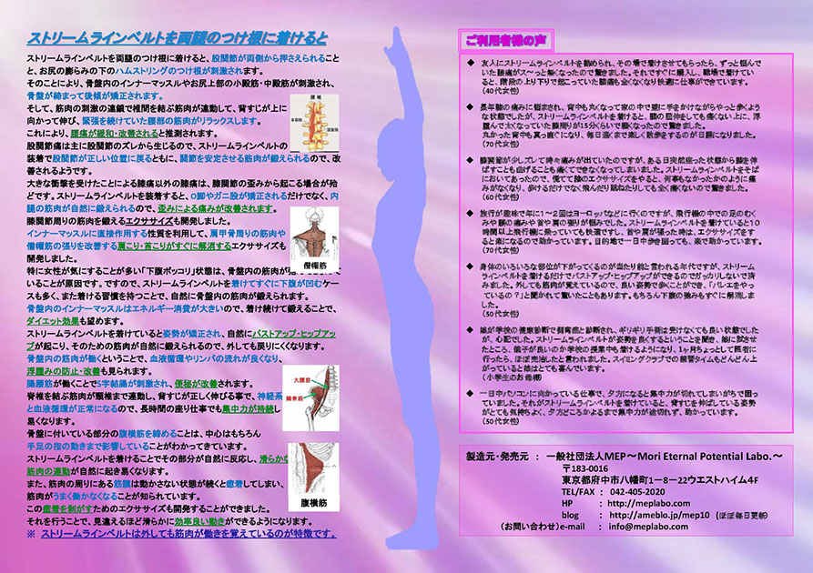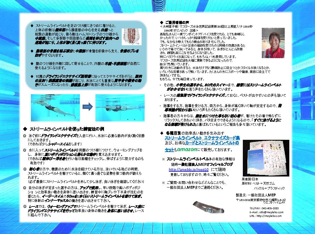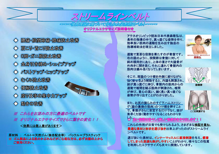 付属のストリームラインベルト・エクササイズは、泳ぐ前に行うと驚きの変化を起こし、毎日続けると、